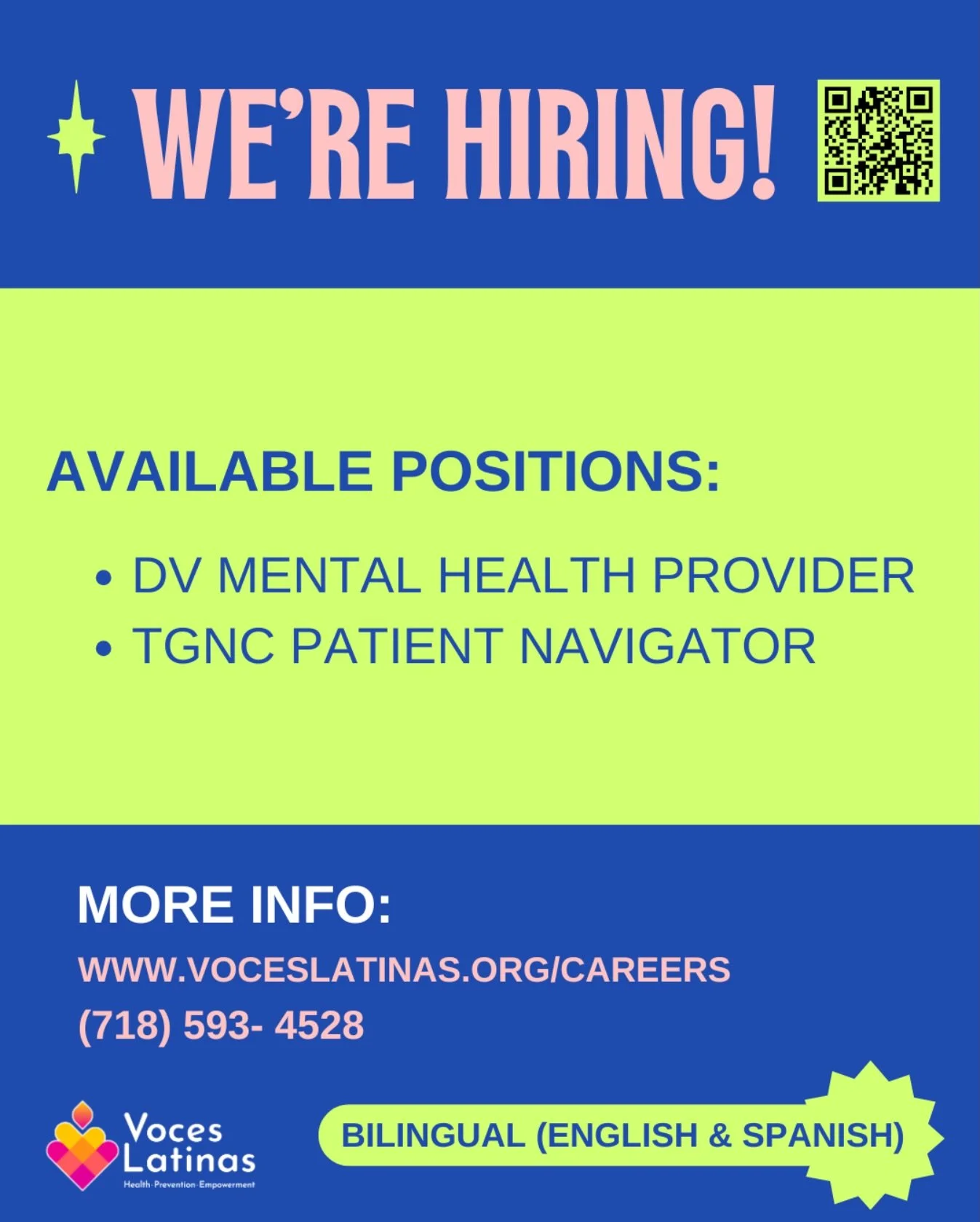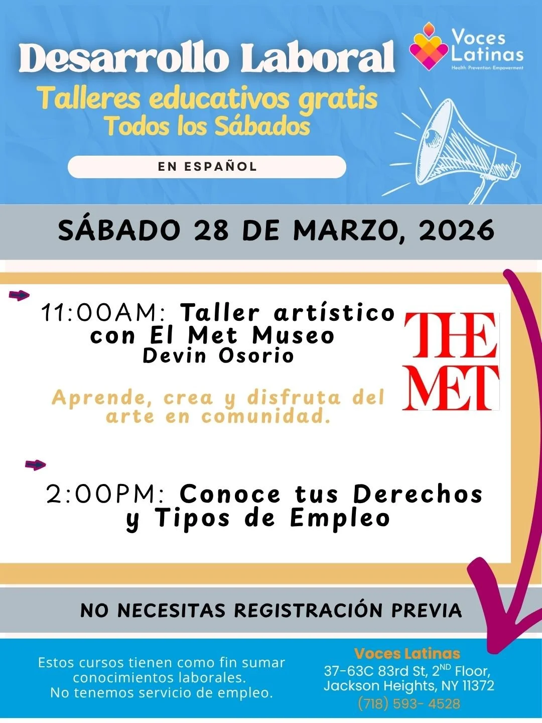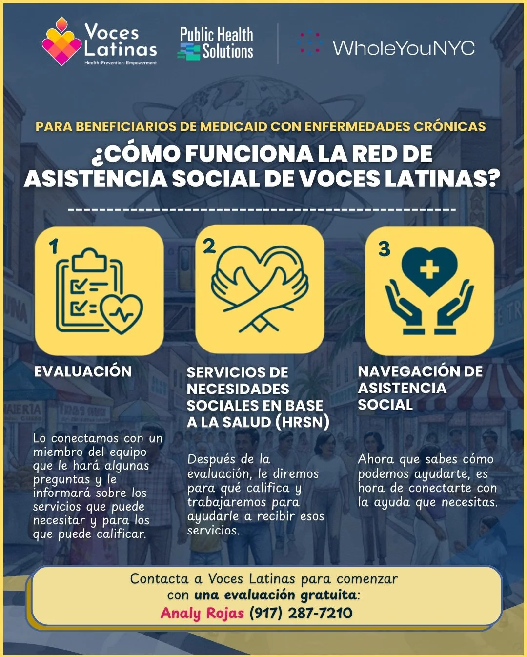 ¡Bienvenidos a Voces Latinas! Durante 22 años, hemos sido una parte fundamental de Queens, difundiendo la luz de la esperanza y defendiendo el bienestar de nuestra comunidad. Creemos que cuidar a nuestros vecinos significa mantener seguras a nuestras comunidades. A través de programas culturalmente sensibles en salud, prevención y empoderamiento, nos solidarizamos con inmigrantes y familias latinas, garantizando el acceso a recursos vitales y apoyo. Explora nuestro sitio para conocer más sobre nuestros servicios y descubrir cómo podemos trabajar juntos por un futuro más fuerte y saludable.