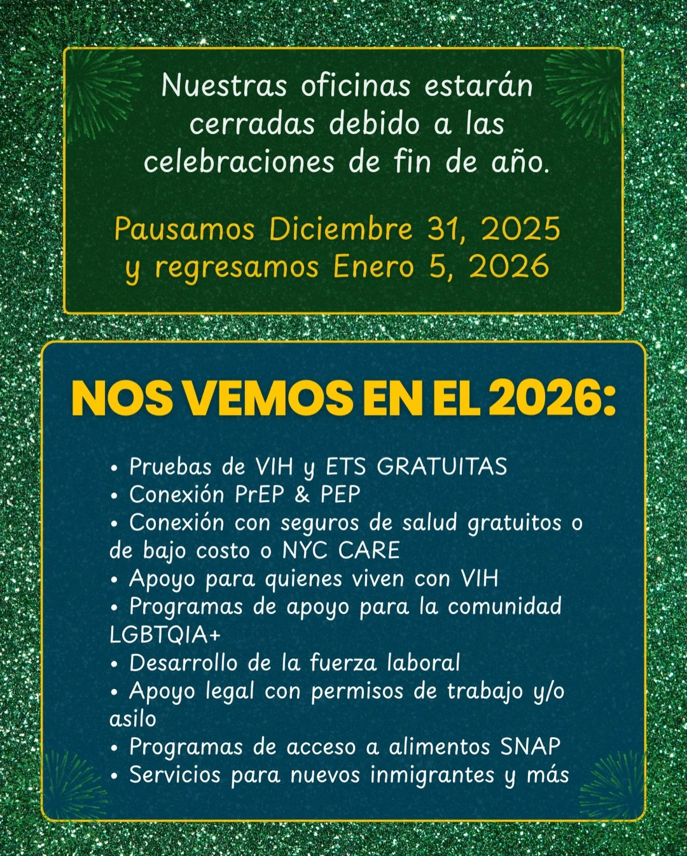At our main offices in Jackson Heights, Queens, one of the most diverse neighborhoods in the United States, we offer consultations about our services, connection to complimentary services by partner organizations, HIV & STI tests -- all completely free.