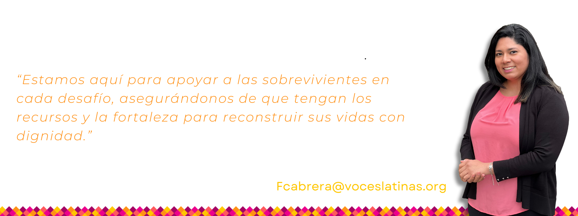 El programa de Violencia Doméstica y Violencia de Pareja Íntima de Voces Latinas apoya a las sobrevivientes con servicios culturalmente sensibles. Ofrecemos planes de seguridad personalizados que empoderan a las personas para manejar emergencias de manera segura y efectiva. Nuestro equipo dedicado brinda apoyo constante, acompañando a las sobrevivientes en los tribunales y ofreciendo asistencia presencial, virtual y en grupos de apoyo. Al atender necesidades urgentes de seguridad y conectar a las sobrevivientes con servicios culturalmente competentes, ayudamos a fortalecer su resiliencia y les ofrecemos un apoyo inquebrantable a lo largo de su camino.
